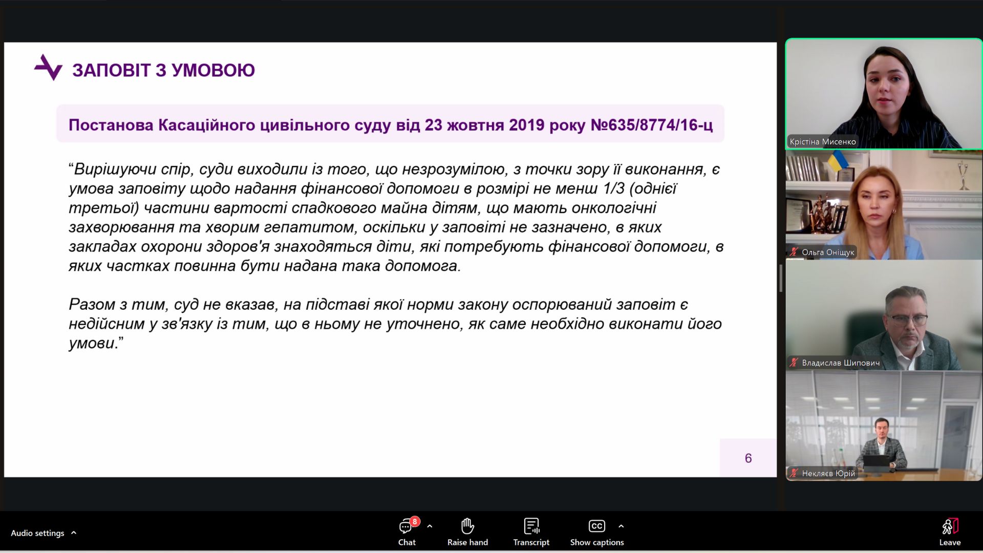 Пані Крістіна розповіла про обмеження, які накладає обов’язкова частка — наприклад, у випадку малолітніх чи непрацездатних дітей — і навела порівняння з іноземними правовими системами, зокрема Польщею та Францією, де обов’язкові частки можуть бути жорсткішими. Вона також окреслила можливі інструменти заповітного розпорядження: заповіт з умовою, заповідальний відказ, призначення виконавця заповіту та зобов’язання спадкоємців виконувати певні обов’язки (непов’язані з майном). У прикладі із заповітом з умовою вона навела справу, де спадкодавець відтермінував поділ майна до досягнення спадкоємцем повноліття, і зазначила, що такі умови мають бути конкретними, щоб не втратити чинність. Спікерка також пояснила, що заповідальний відказ не зменшує обов’язкову частку й не може перевищувати обсяг спадкового майна, що залишився після задоволення зобов’язань спадкодавця.