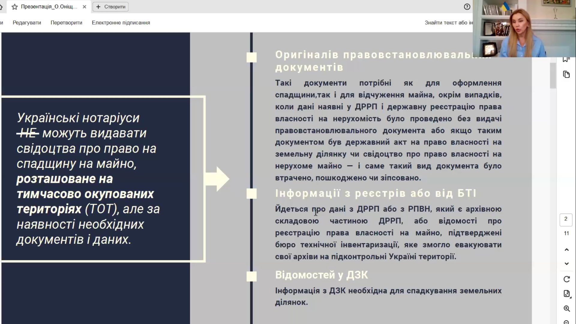 Вона спростувала поширений міф про те, що українські нотаріуси не можуть оформлювати спадщину або посвідчувати договори на нерухомість, яка знаходиться на окупованих територіях. За словами спікерки, нотаріуси продовжують виконувати ці функції, але за дотримання певних умов — насамперед наявності оригіналів право-встановлювальних документів та внесення відповідної інформації до державних реєстрів. Вона звернула увагу на те, що державний реєстр прав власності в Україні функціонує з 2002 року, і навіть відомості зі старих систем є чинними у спадкових справах.