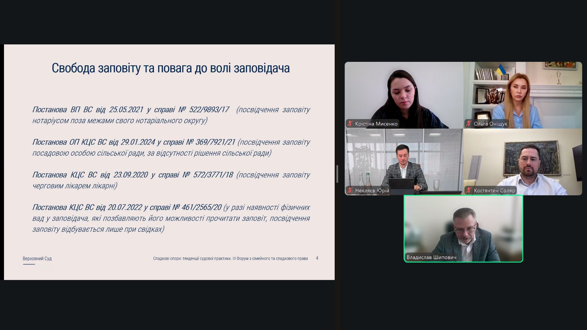 Суддя Верховного Суду у Касаційному цивільному суді Владислав Шипович представив огляд актуальної судової практики у спадкових спорах, акцентувавши на трьох ключових напрямах її розвитку: свободі заповіту та повазі до волі заповідача, добросовісності та ретельності реалізації прав, а також забезпеченні стабільності цивільного обороту.