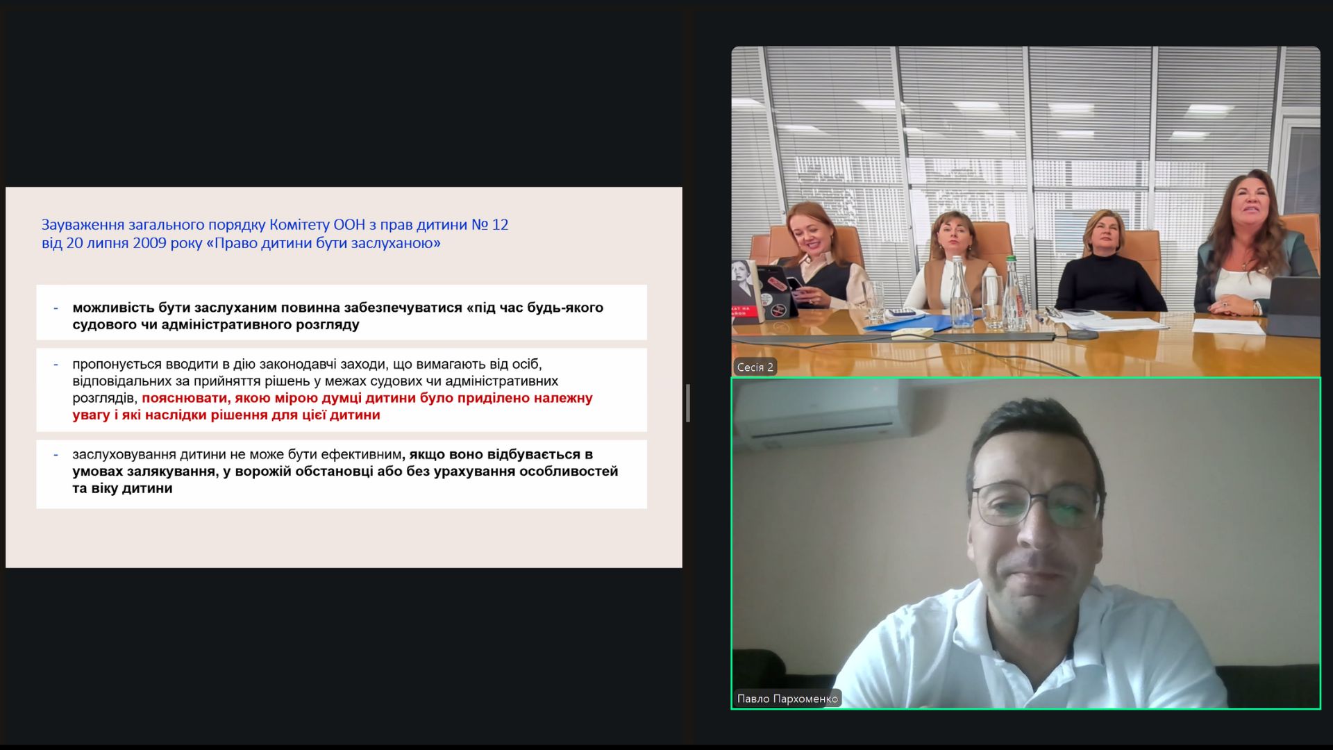 Суддя Верховного Суду у Касаційному цивільному суді Павло Пархоменко присвятив свій виступ реалізації статті 12 Конвенції ООН про права дитини — базового права дитини вільно висловлювати свої погляди в усіх справах, що її стосуються, та бути заслуханою в судових і адміністративних процедурах.