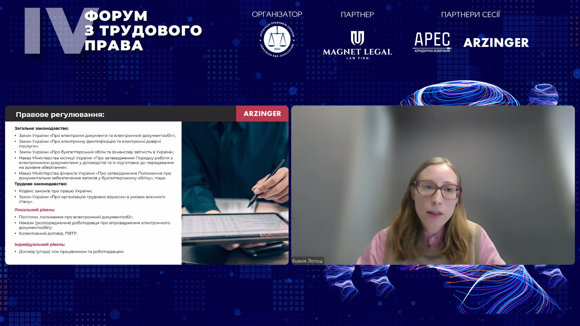 Темі електронного документообігу з працівниками та практичним викликам його застосування присвятила свій виступ Ксенія Лотош, керівна юристка та співкерівниця практики трудового права АО «Арцінгер». Вона зазначила, що цифровізація трудових відносин стала об’єктивною відповіддю на виклики пандемії COVID-19 та воєнного стану, однак навіть за відсутності цих факторів рух у бік електронного обміну документами був неминучим. Водночас, за словами експертки, трудове законодавство містить украй обмежену кількість спеціальних норм щодо електронного документообігу, що створює значну кількість практичних запитань.