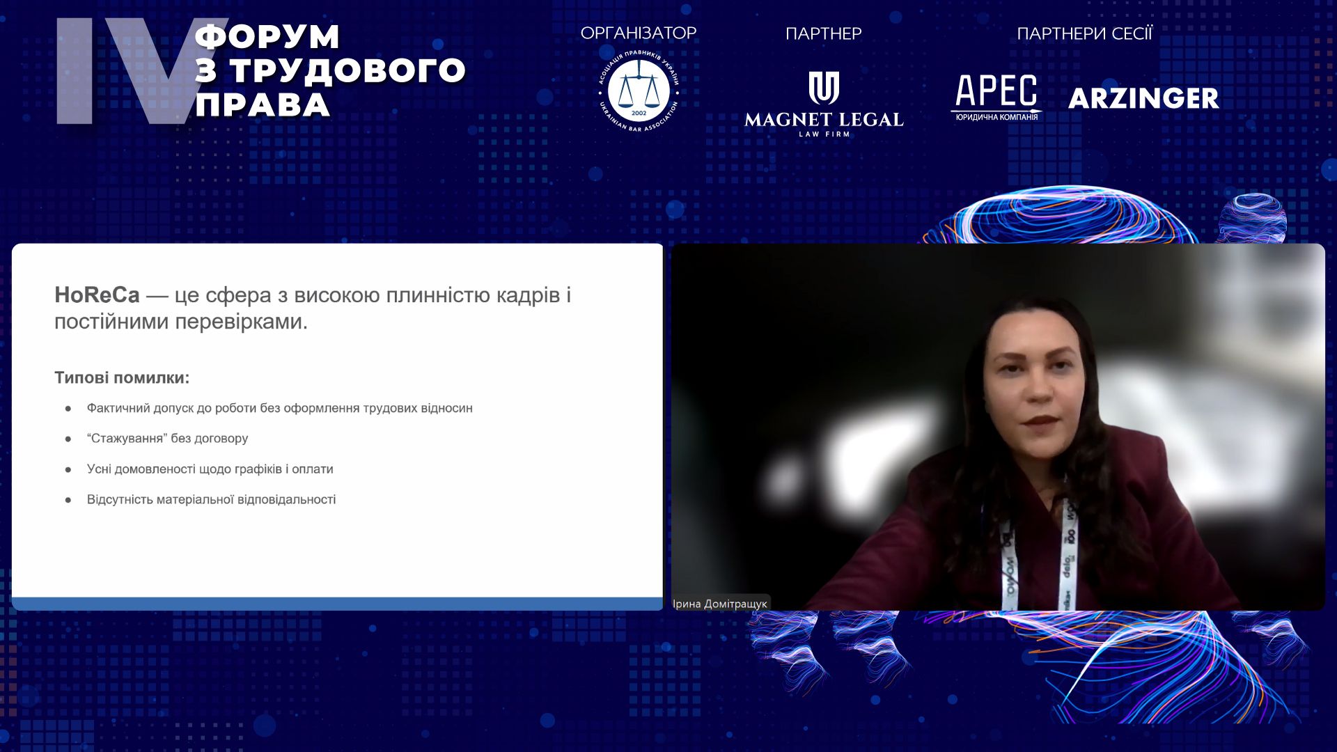 Окремо спікерка зупинилася на типових помилках роботодавців у сферах HoReCa та ритейлу. Вона звернула увагу на практику допуску працівників до роботи без належного оформлення, стажування без трудових договорів, усні домовленості щодо умов праці та відсутність договорів про матеріальну відповідальність. З огляду на контрольні заходи з боку Держпраці та сформовану судову практику, Ірина Домітращук наголосила на необхідності укладення трудових договорів з урахуванням реальних умов роботи, підкресливши, що універсальних шаблонів не існує, а договір має відповідати фактичним бізнес-процесам і слугувати інструментом захисту як для роботодавця, так і для працівника.