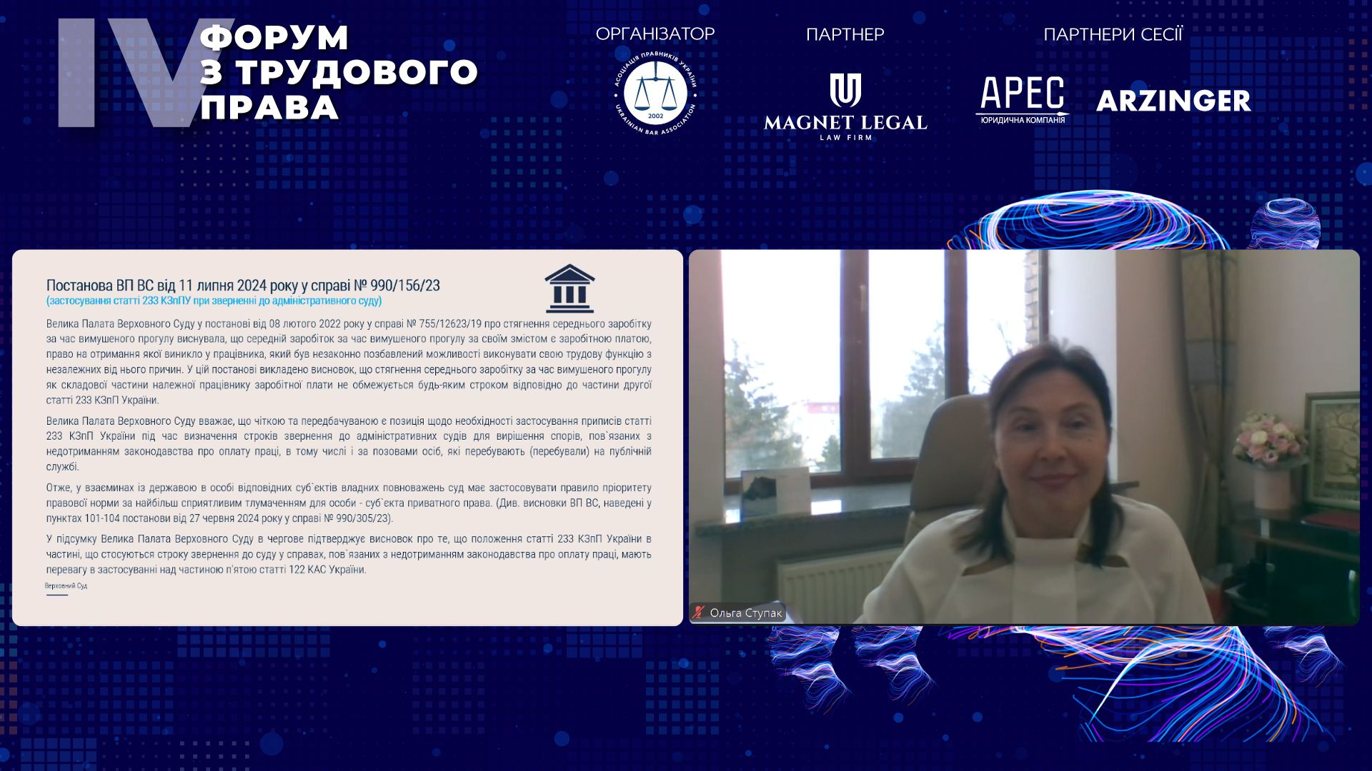 У своєму виступі Ольга Ступак також зупинилася на судовій практиці щодо інституту призупинення дії трудового договору, який, на її переконання, має вимушений характер і навряд чи зможе існувати в умовах мирного часу. Вона звернула увагу на позиції Верховного Суду щодо оцінки правомірності звільнень, зміни умов праці та поважності причин відсутності працівника на роботі в умовах війни, а також на принципово важливі підходи до строків звернення до суду у справах про стягнення заробітної плати. Суддя наголосила, що останні рішення Конституційного Суду України підтвердили необхідність забезпечення ефективного доступу до правосуддя та недопущення непропорційного обмеження трудових прав працівників навіть у період воєнного стану.