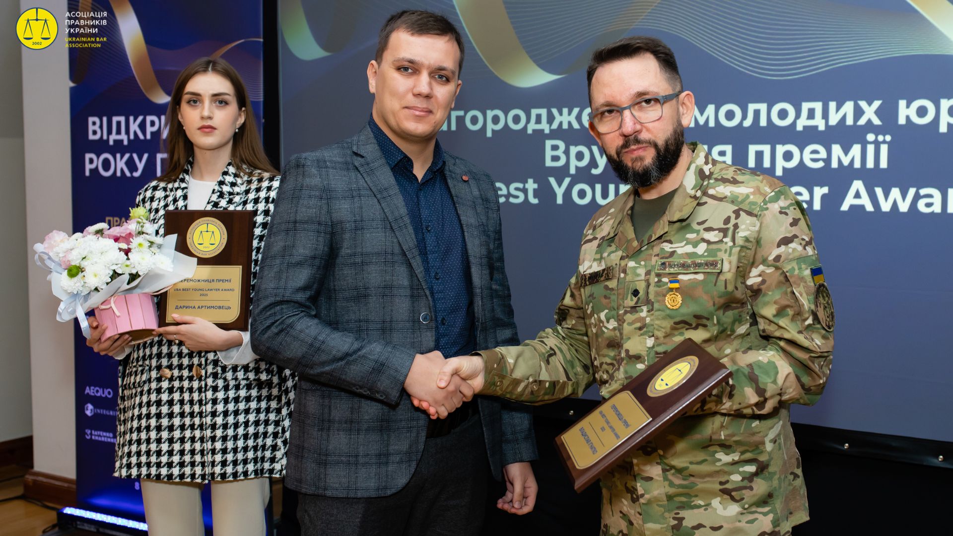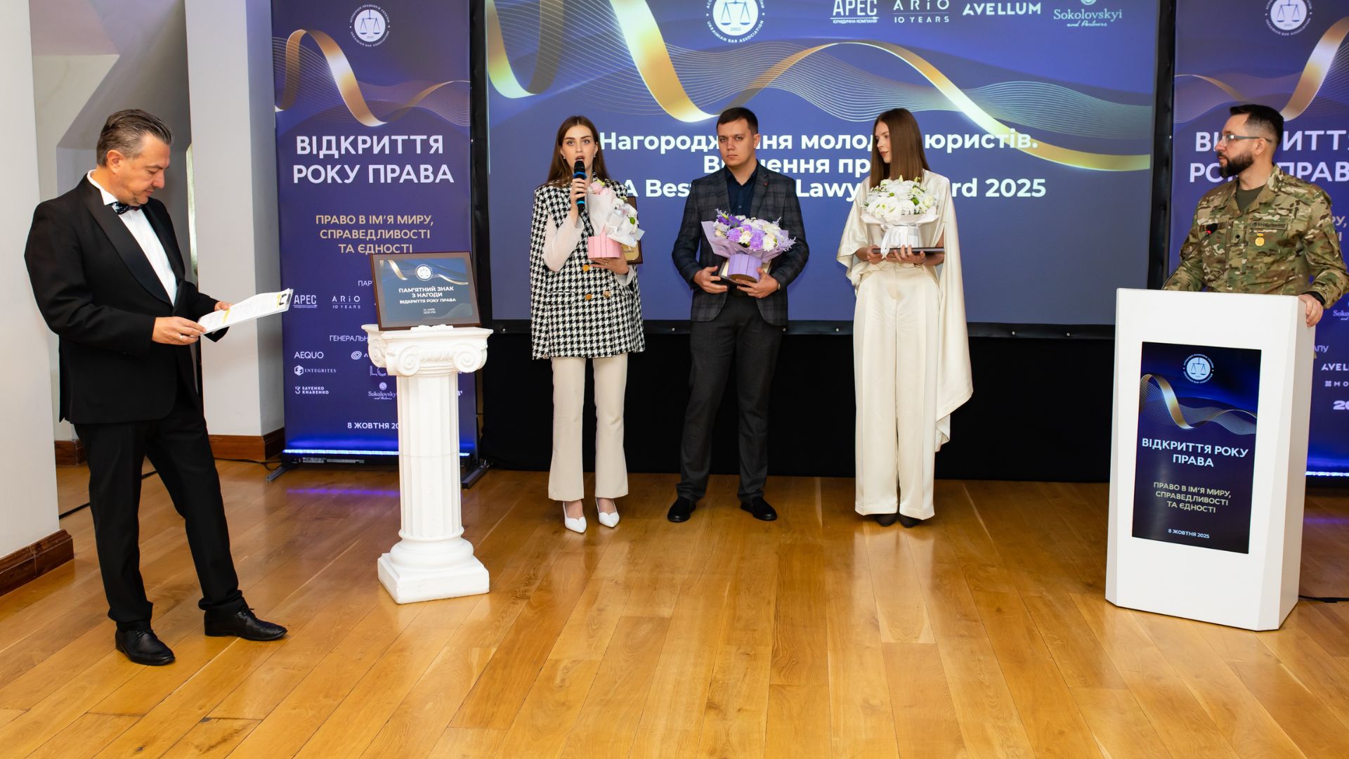 Вітати лауреатів і вручати їм нагороди випала честь Андрію Романчуку — військовослужбовцю 13‑ї бригади НГУ «Хартія», керівнику служби організаційно‑правової роботи 2-го корпусу «Хартії» та засновнику юридичної компанії MORIS, який сам цього року отримав Почесну відзнаку АПУ «За честь і професійну гідність».